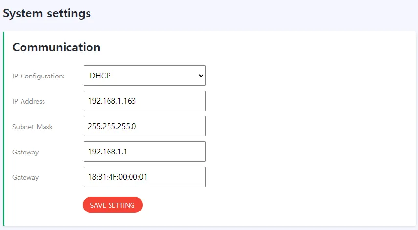For a static IP address, enter the appropriate values for the IP address, subnet mask, and default gateway. Click the “SAVE SETTING”
