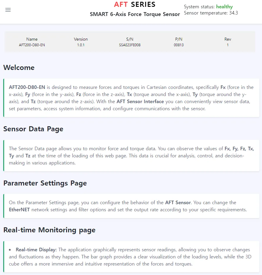 When the user enters the sensor’s IP address into the browser address field, the Ethernet F/T Welcome page appears. The Welcome page gives an overview of the AFT200-D80-EN main functions. The bottom of the page lists the calibration used by this configuration.