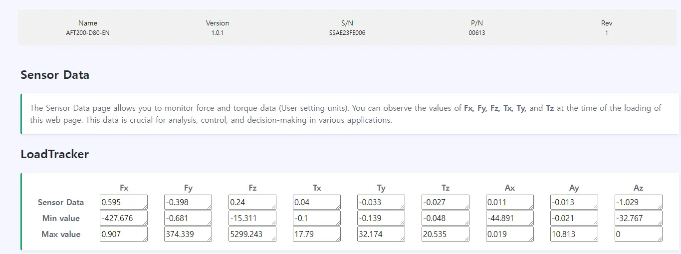 This page displays the current sensor loading conditions. The information on the Sensor Data page is static and becomes current after a user loads or reloads the page.
