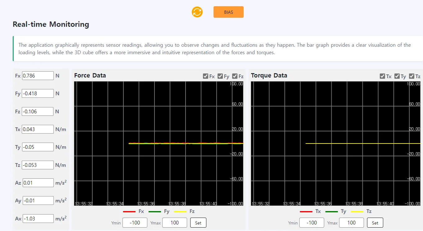 The AIDIN ROBOTICS sensors provide resolved force and torque data measured in N and Nm accordingly.