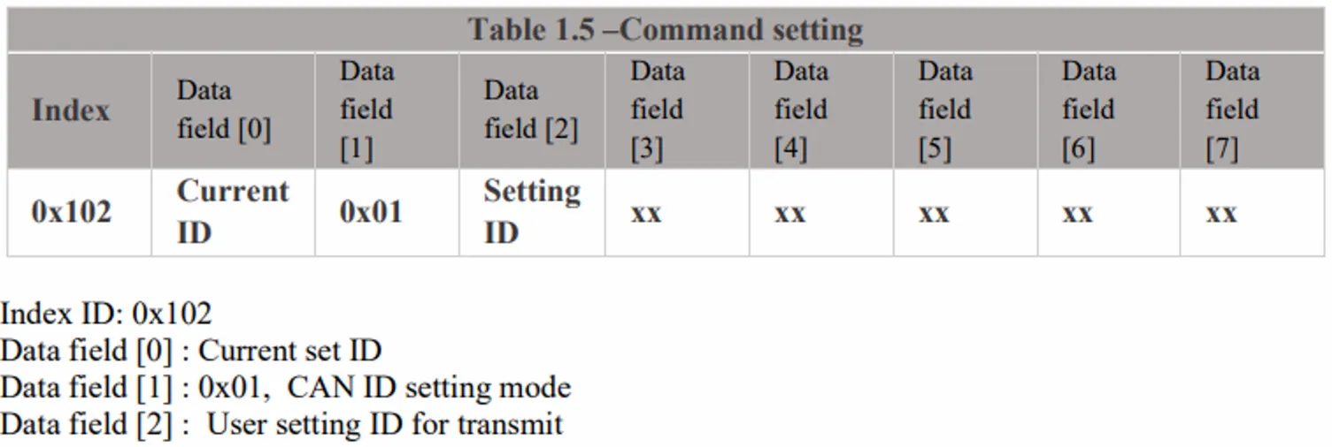 ex) Change ID to 0x0A: ID 0x102, Data 01 01 0A (hexadecimal)